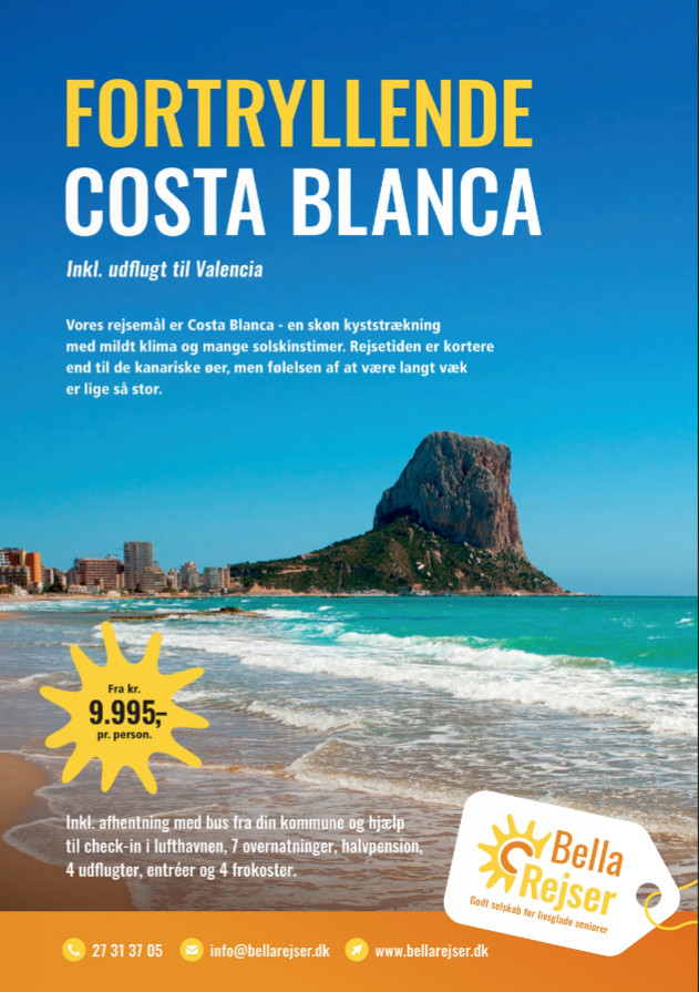 Vores rejsemål er Costa Blanca - en skøn kyststrækning med mildt klima og mange solskinstimer. Rejsetiden er kortere end til de kanariske øer, men følelsen af at være langt væk er lige så stor.