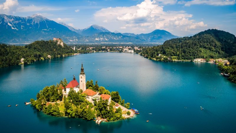 Det gamle Bled-slot overvåger sceneriet fra en lodret klippe, og ude i søen ligger den lille ø Blejski otok med den fine Jomfru Marias Himmelfarts-kirke. Når kirkens tårn spejler sig i vandet, bliver det ikke smukkere. Det er ren idyl.