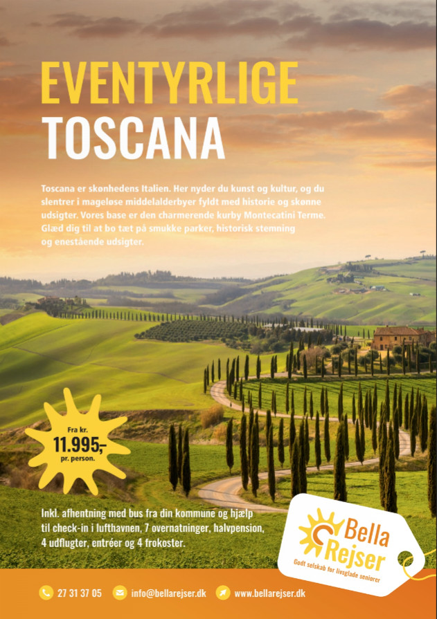 Toscana er skønhedens Italien. Her nyder du kunst og kultur, og du slentrer i mageløse middelalderbyer fyldt med historie og skønne udsigter. Vores base er den charmerende kurby Montecatini Terme. Glæd dig til at bo tæt på smukke parker, historisk stemning og enestående udsigter.